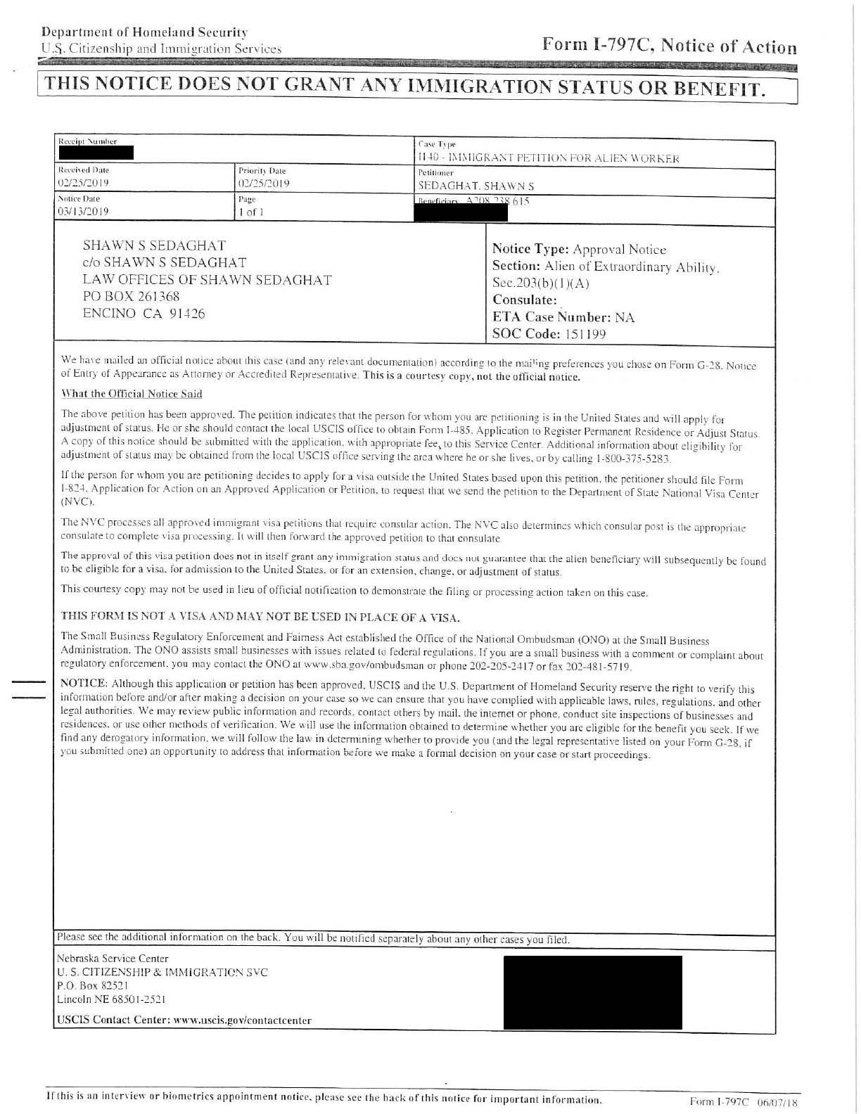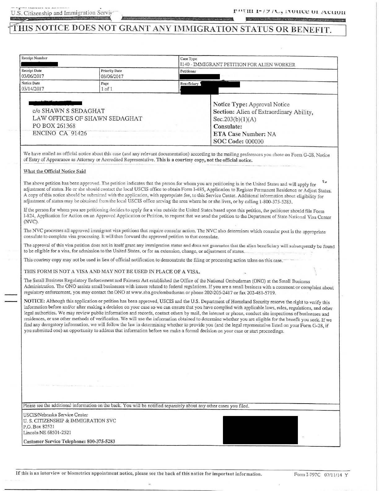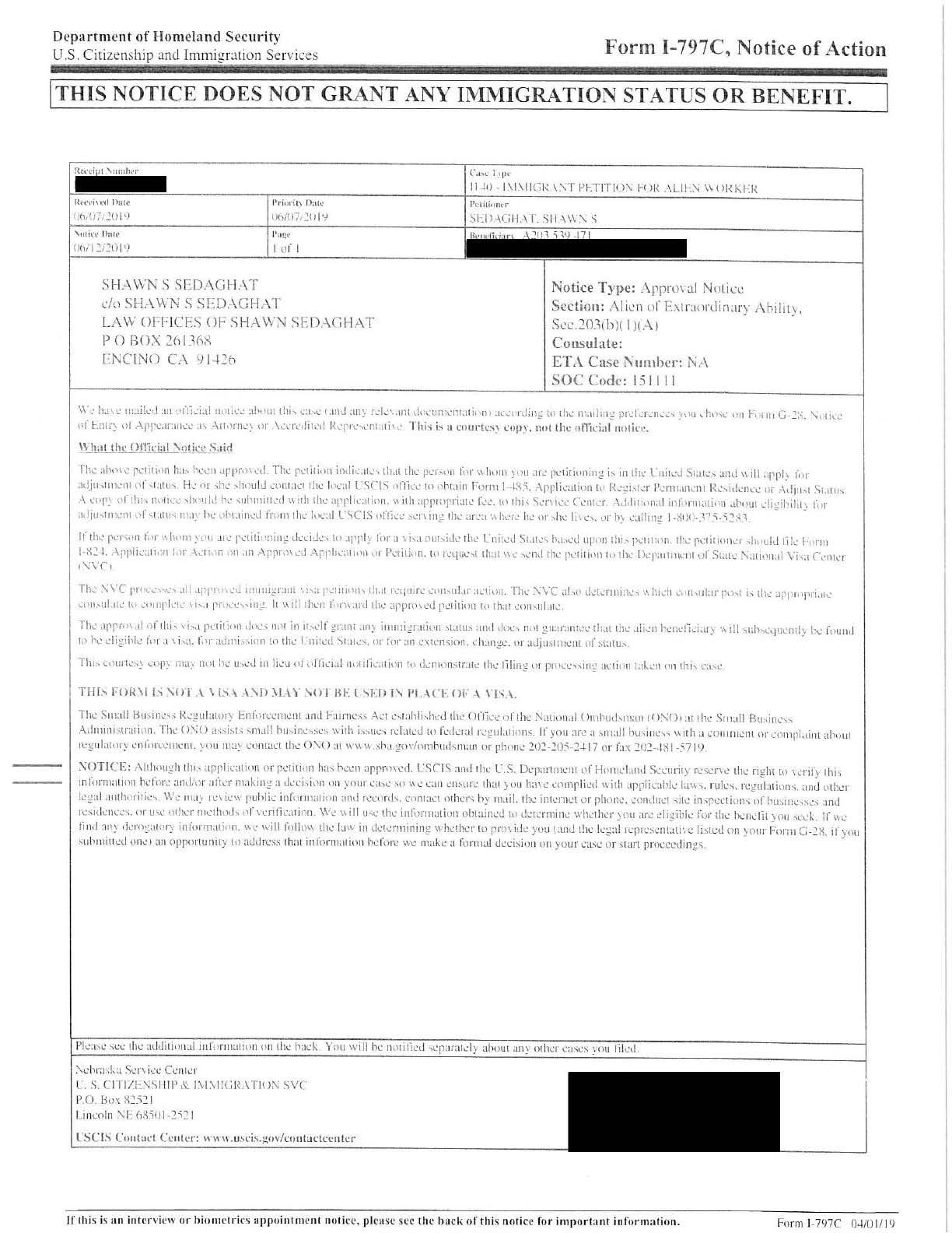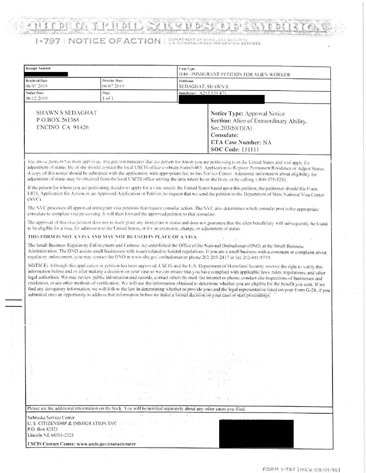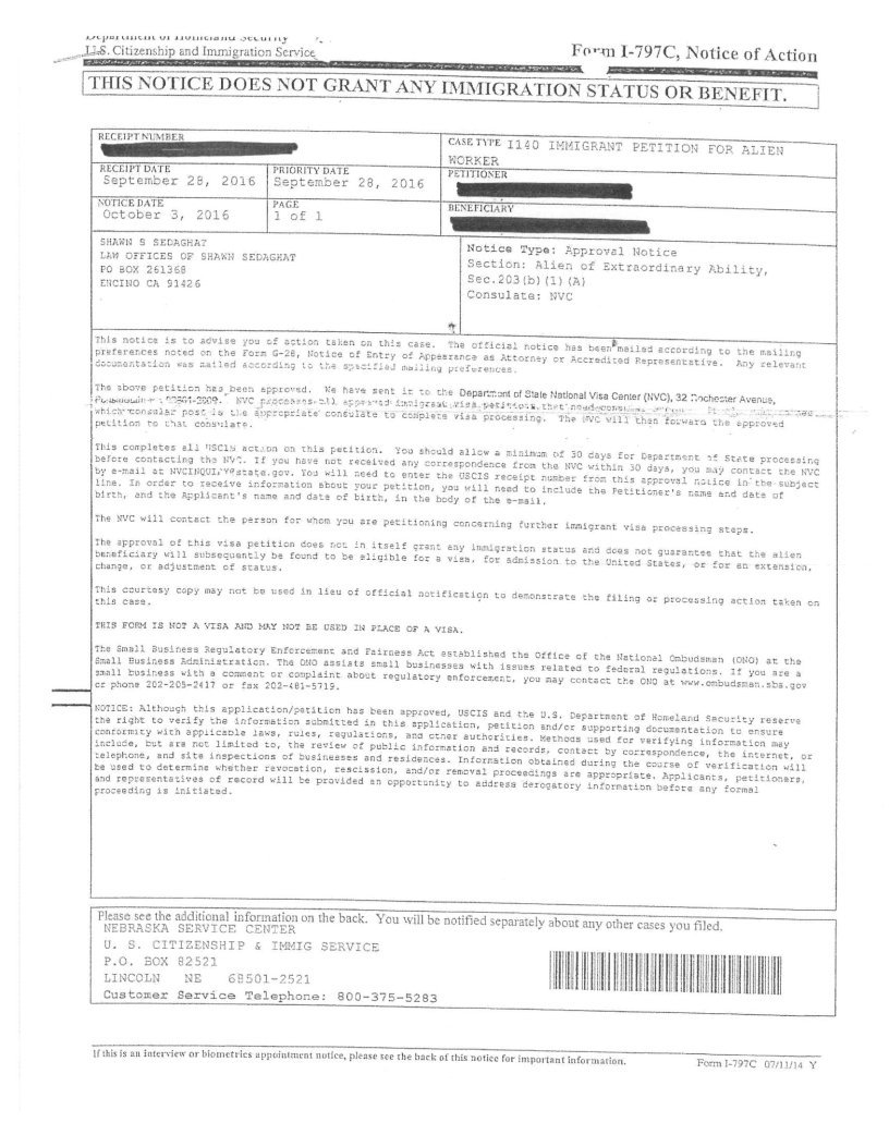 CIS received our petition on a Tuesday and issued the approval on a Thursday. This breaks our office's own record for a speedy EB1-A approval without a Request for Evidence (RFE).